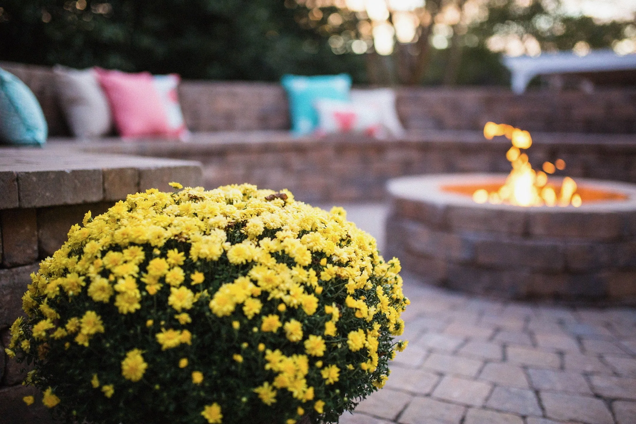 One featured image shows yellow chrysanthemums, a popular seasonal plant in Wilmington landscapes. Mums thrive in cooler months and are often used to add fall color near seating areas, hardscapes and entryways. Their dense blooms and compact shape make them ideal for decorative accents that elevate outdoor spaces.