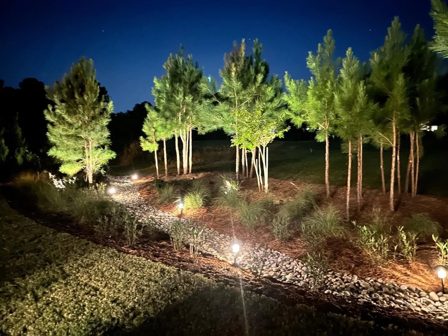 The nighttime landscape photo highlights the use of grasses paired with lighting to create depth and texture. Muhly Grass, in particular, is a standout choice in Wilmington. It is drought tolerant, low maintenance and known for its soft plumes that add seasonal interest.